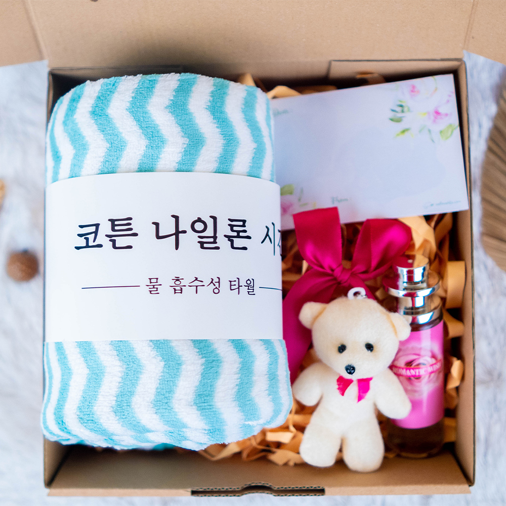 Hampers Gift Box Handuk 50x100, Parfum, Gantungan Kunci Boneka, Kartu Ucapan