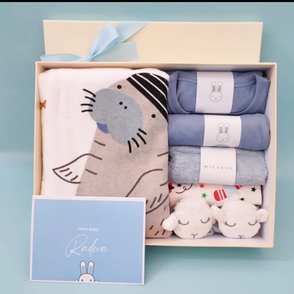 Hampers Balita, ( 1 Set Long Sleeves Pajamas - 1 - 1 Pair of Shoes - 1 Towel 1 Bib / Slabber - Customised Greeting Card )